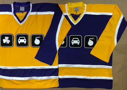 Lila-goldene Hockey-Trikots mit einem Irish Car Bomb Twill-Logo